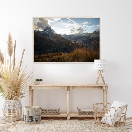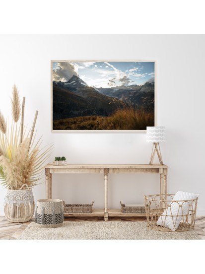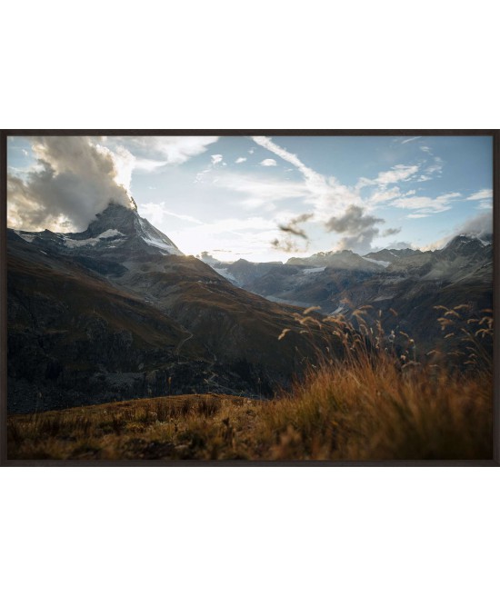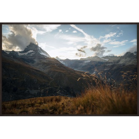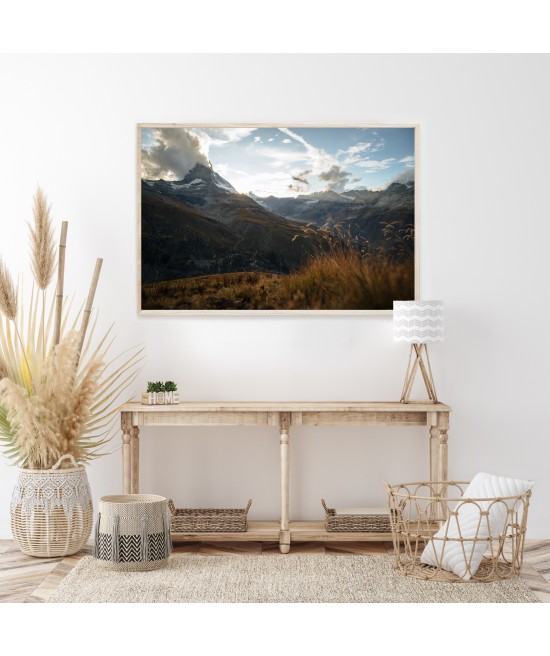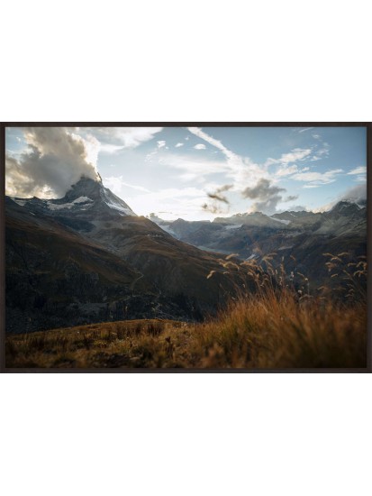 Wandposter mit einer alpinen Landschaft, in dem sich einer wegen seiner markanten Gestalt bekanntesten Berge der Welt in den Wolken versteckt. Das Matterhorn ist ein Berggipfel, dessen klassische Silhouette oft als Symbol des Berges an sich dient, ist die berühmteste Erhebung und das Symbol der Schweiz. Hochgebirgslandschaft mit einem geheimnisvollen, in den Wolken verborgenen Akzent. Eine Berglandschaft, die zu neuen Herausforderungen motiviert und die Kraft und Schönheit der Natur verdeutlicht.