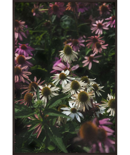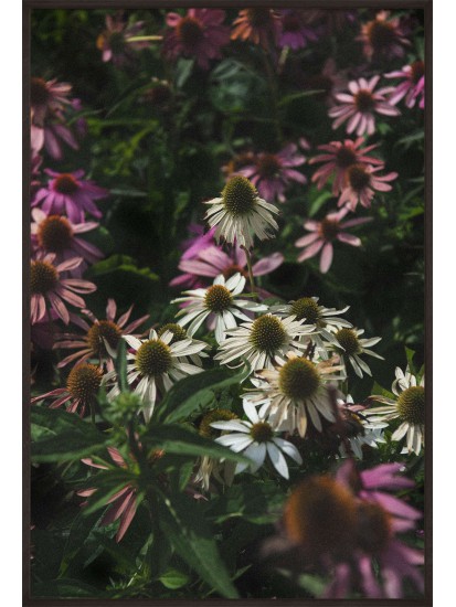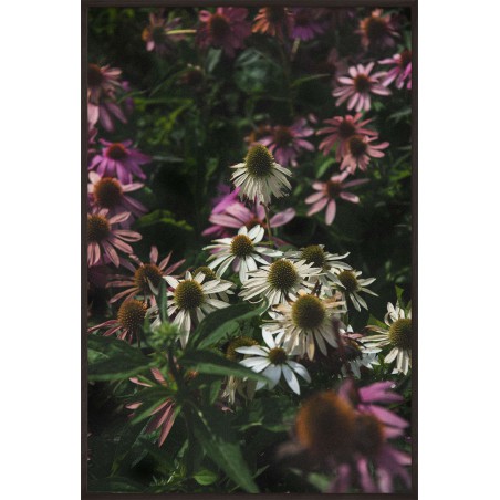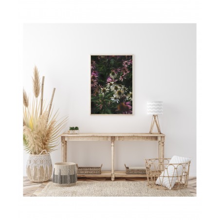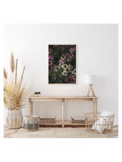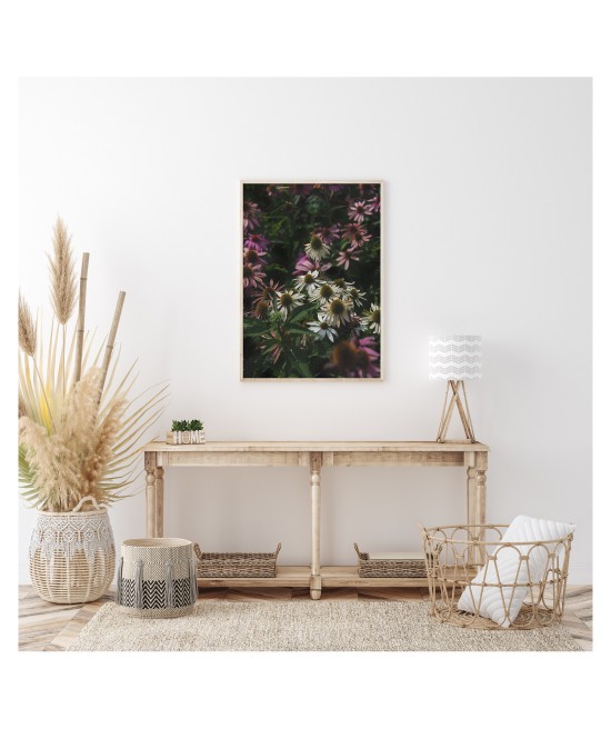 Decorative poster with a photograph of a meadow covered with echinacea flowers. This wild flower has been known for many years and is commonly used in natural medicine. Its healing properties were discovered by native Americans who used it to treat a range of conditions from the common cold to venomous snakebites. The poster presents the enigmatic beauty of wild nature. The seeming lack of harmony encourages a search for order, forces you to discover new solutions and provides a source of inspiration. Use it in spaces where you work creatively and inventively.