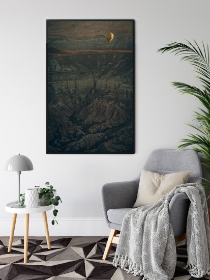 Wall poster of mountainous Moroccan scenery, showing the mighty Atlas range. The image shows the power of nature, the majesty of the mountains, the desert and the abundant flora of the oasis from which the landscape was captured Opposing circumstances. This decorative poster inspires emotion and respect. Beautiful scenery for general types of room - receptions, waiting rooms, living rooms.