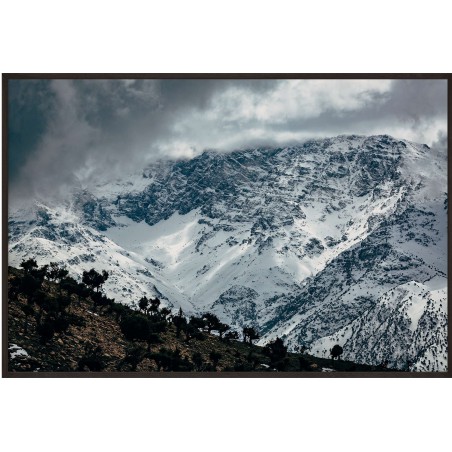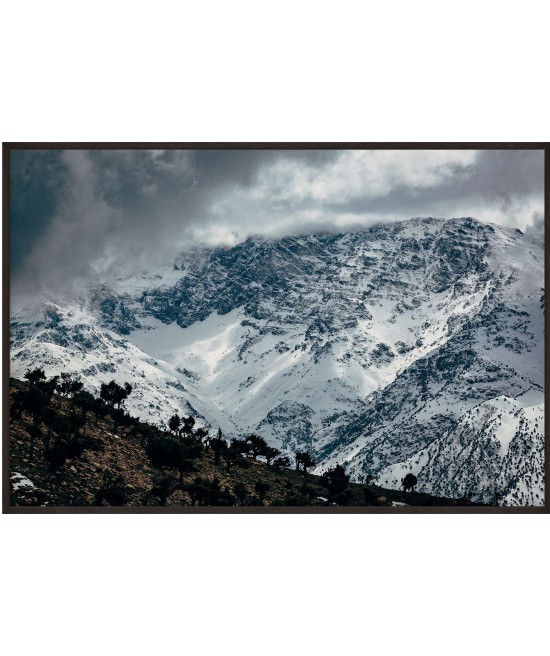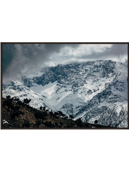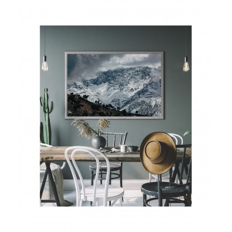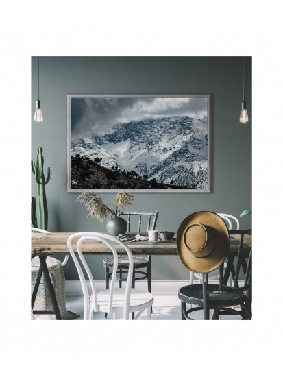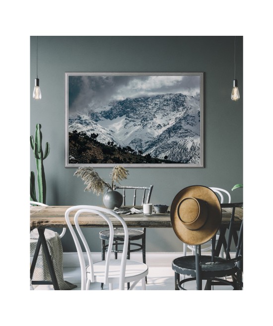 Wall poster of mountainous Moroccan scenery, showing the mighty Atlas range. Snowy slopes alongside the heat of the desert. The image portrays the power of nature, the majesty of the mountains surrounded by clouds, and the desert - the elements which give life, but can also take it away. Contradictory signals from nature - the clouds augur a storm, while the desert symbolises a lack of water. This decorative poster inspires emotion and respect. Beautiful scenery for general types of room - receptions, waiting rooms, living rooms.