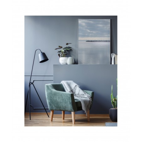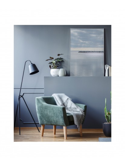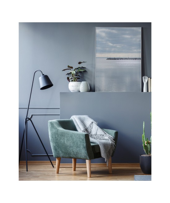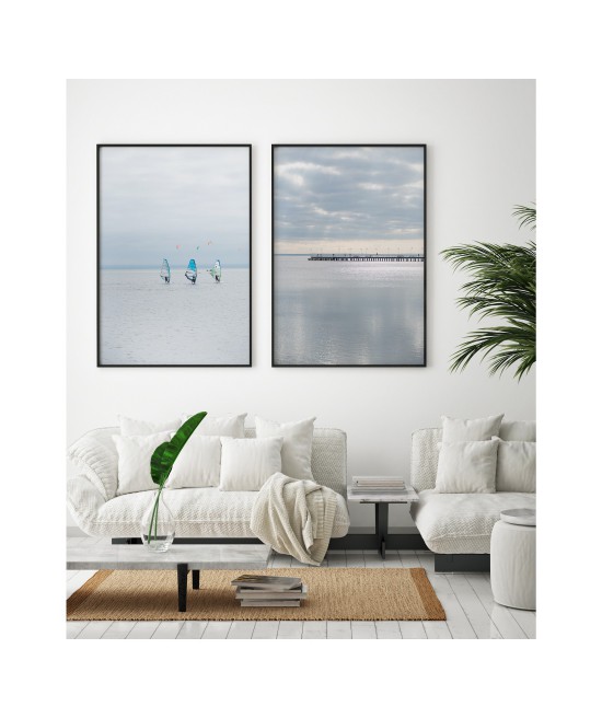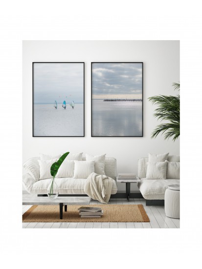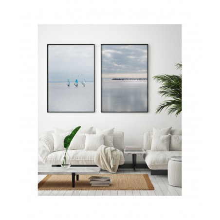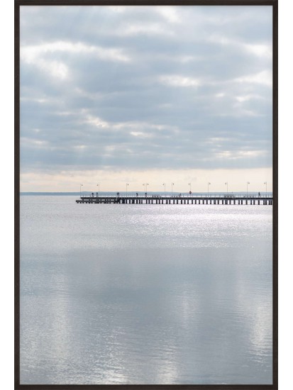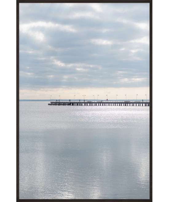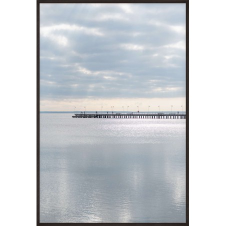 Wall poster of a seascape. A pastel combination of the colours of a calm sea and a distant horizon cut through with the shadow of a protruding pier. The inexorably approaching sunset gently illuminates the clouds, forming an unusual interplay of light. A discrete and very elegant poster which encourages tranquillity and reason.