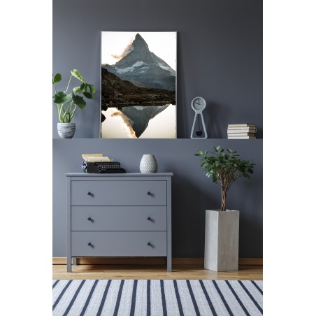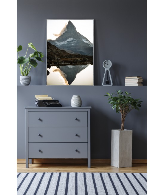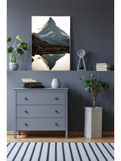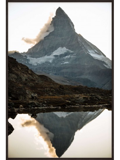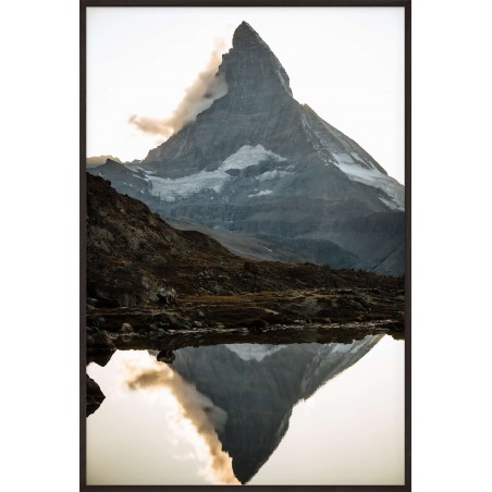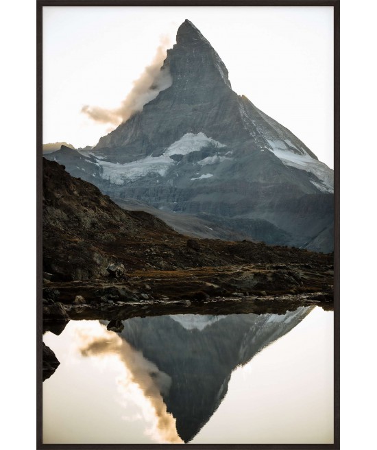Wall poster with one of the world’s most distinctive mountain masses. The Matterhorn, whose classic silhouette is often taken as a symbol of mountains in general, is Switzerland’s most famous mountain and symbol. A decorative poster of the sun ending the day hiding behind a ridge, leaving the valley in darkness. Mountain scenery demonstrating the synergy and beauty of nature.