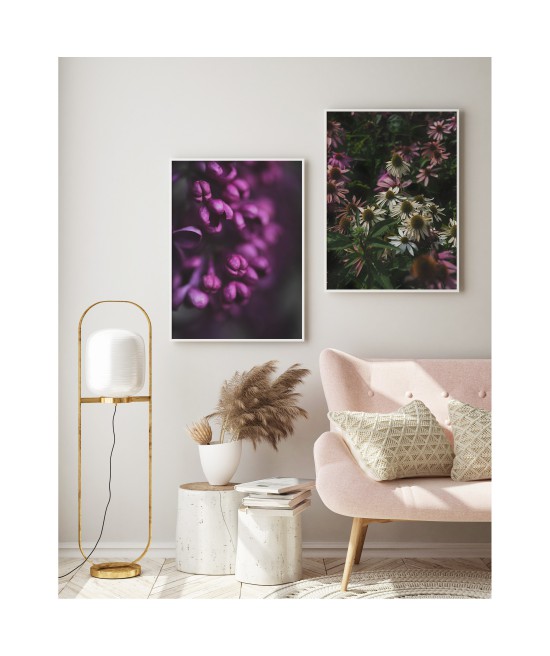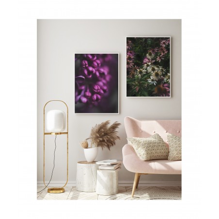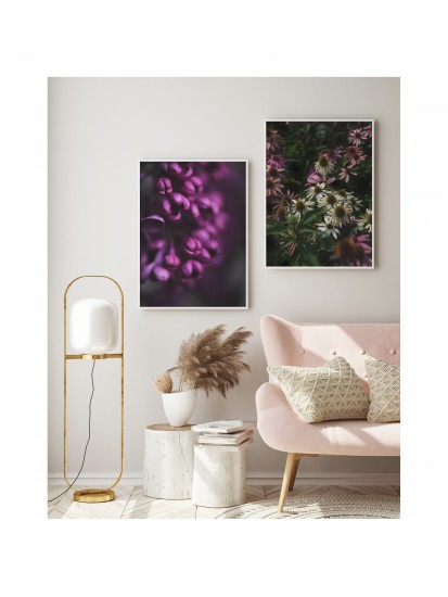 Bez to tysiące niezależnych kwiatów, każdy z nich to osobne dzieło natury i niezależny twór, wiosną toczą walkę o wyprodukowanie  jak najintensywniejszego zapachu. Efektem jest oszałamiający zapach i fioletowe kwiaty. Plakat dekoracyjny Lilac focus prezentuje zbliżenie pojedynczych kwiatów fioletowych kwiatów bzu. Zdjęcie pobudza wyobraźnię i zachwyca doskonałością natury. Plakat intrygujący – wykorzystuj odpowiedzialnie.