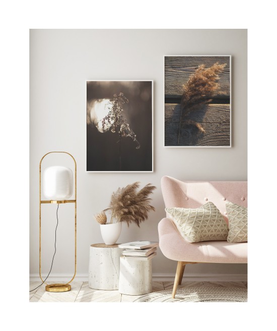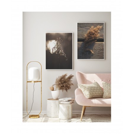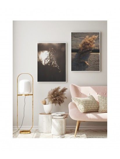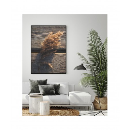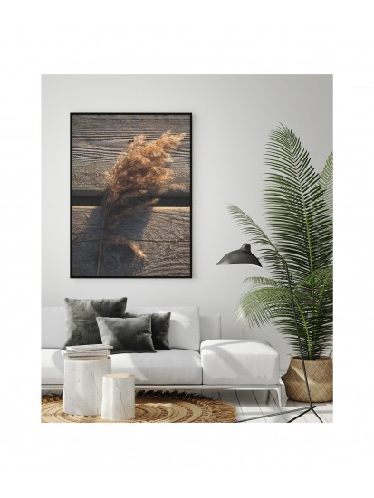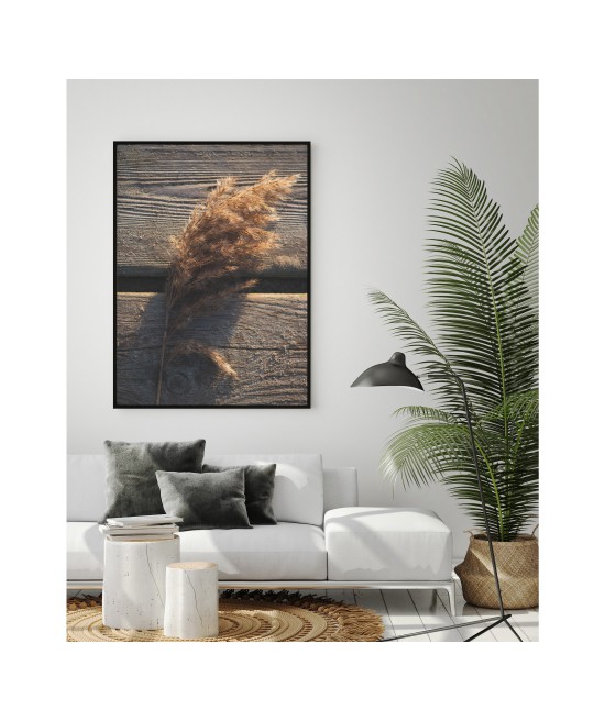 Plakat na ścianę nastrojowy, roślina ułożona na wysuszonych deskach starej stolarni. Jesienne, nisko wznoszące się słońce dopełnia klimatu nieśmiało oświetlając puszysty pióropusz. Plakat dekoracyjny do pomieszczeń klimatycznych i eleganckich.