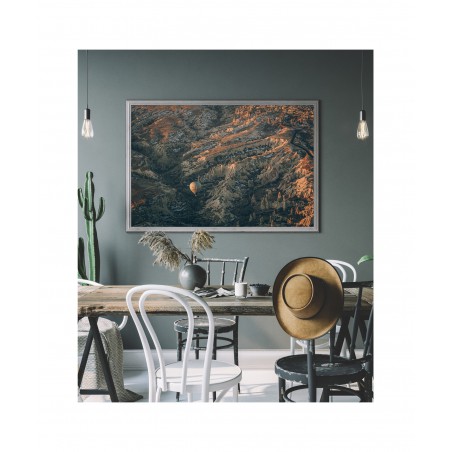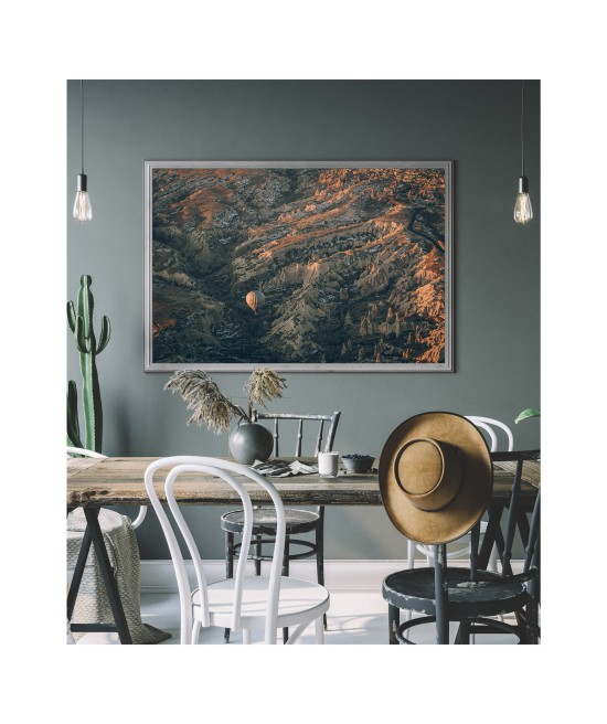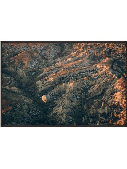 Plakat na ścianę SUNRISE 1 prezentujący piękny wschód słońca w księżycowym krajobrazie Kapadocji. Surrealistycznej krainy leżącej w centrum Turcji, słynącej z niezwykłego pejzażu i organizowanych tam lotów balonem. Zgadniesz skąd zostało zrobione zdjęcie?