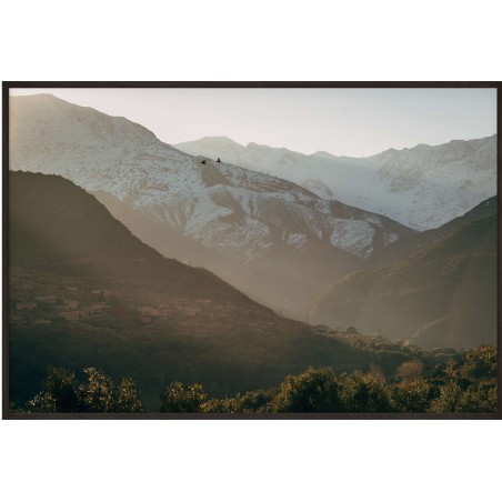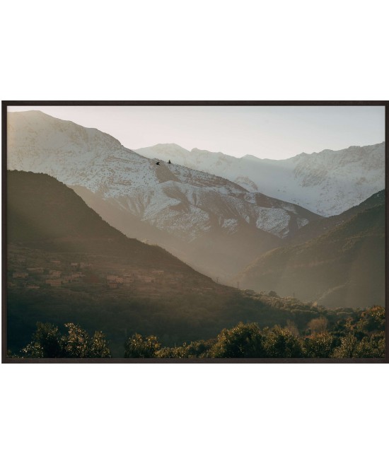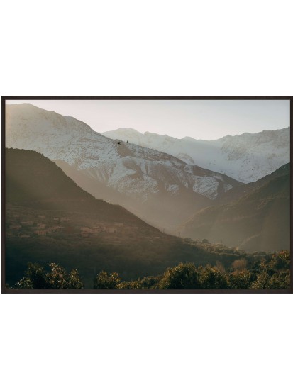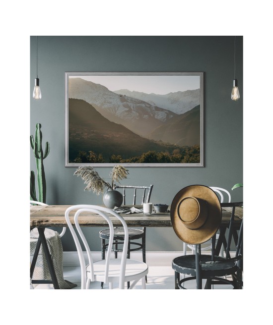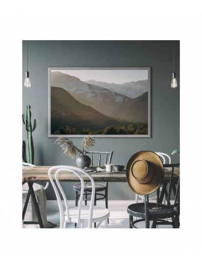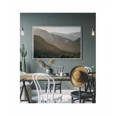 Plakat dekoracyjny z górzystym krajobrazem Maroka, uważne oko w centralnej części obrazu dostrzeże dwa ptaki przemierzające górską dolinę. Plakat na ścianę osoby kochającej wolność i naturę. Pamiętaj - nie każdy odkryje tajemnicę plakatu, a Tobie pod dostojnym pejzażem gór Atlasu dwa niewielkie cienie przypomną o uczuciu wolności, którego doświadczasz na łonie przyrody.