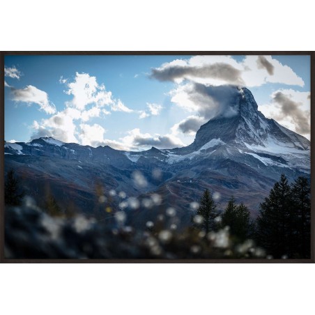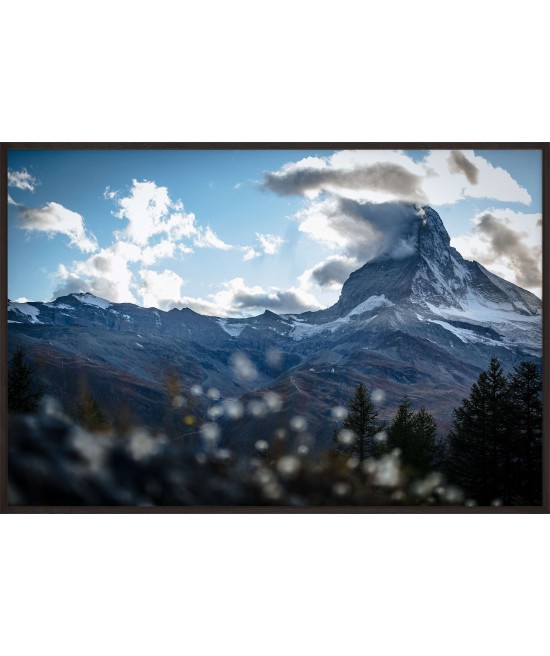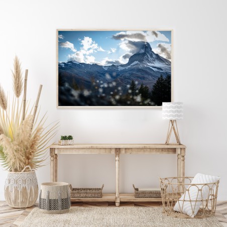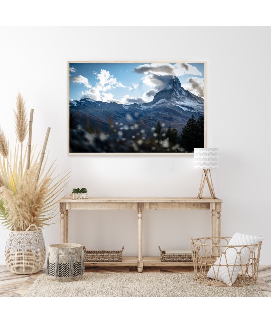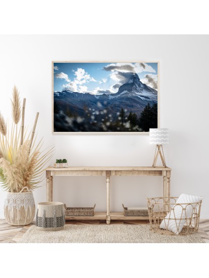 Plakat na ścianę z jedną z najbardziej charakterystycznych brył górskich na świecie. Matterhorn, którego klasyczna sylwetka, jest często utożsamiana z symbolem góry w ogóle, to najsłynniejsza góra i symbol Szwajcarii. Plakat dekoracyjny z obrazem samotnej piramidy wznoszącej się w oddali, z perspektywy kwiecistych łąk Szwajcarii. Groza gór wysokich otoczona sielanką. Pejzaż górski, motywujący do nowych wyzwań, demonstrujący potęgę i piękno natury.