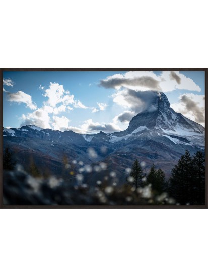 Plakat na ścianę ze spowitą w chmurach jedną z najbardziej charakterystycznych brył górskich na świecie. Matterhorn, którego klasyczna sylwetka, jest często utożsamiana z symbolem góry w ogóle, to najsłynniejsza góra i symbol Szwajcarii. Plakat dekoracyjny z obrazem samotnej piramidy otoczonej chmurami w promieniach zachodzącego słońca. Groza gór wysokich i zmiennej pogody w ciepłym świetle zachodzącego słońca. Pejzaż górski, zachęcający do medytacji, demonstrujący potęgę i piękno natury.
